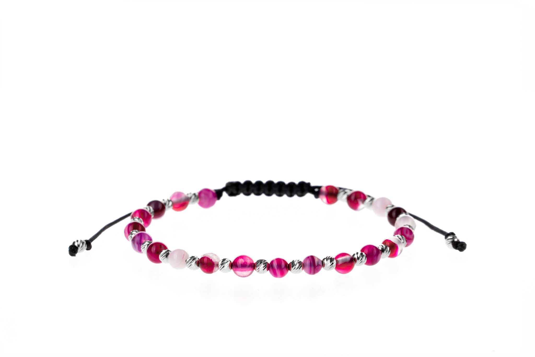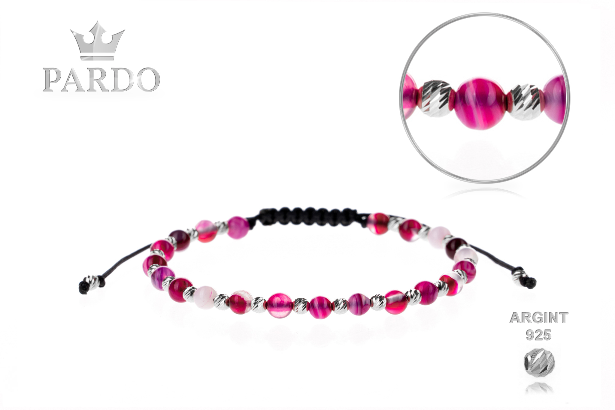 Brățară PARDO cu Argint 925 realizată manual în atelier propriu cu șnur de calitate premium, folosind o combinație unică de sfere striate din Argint 925 import Italia și pietre semiprețioase sau cristale de tip Agat cu diametrul de 4 mm.