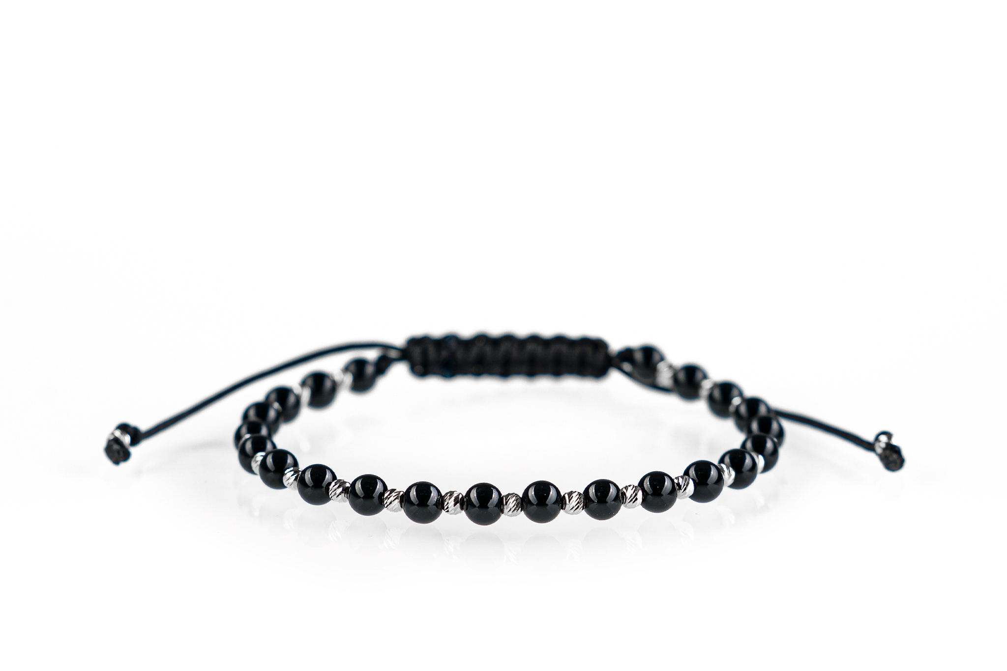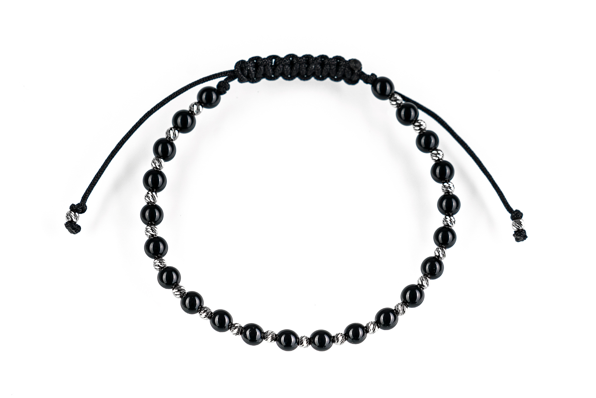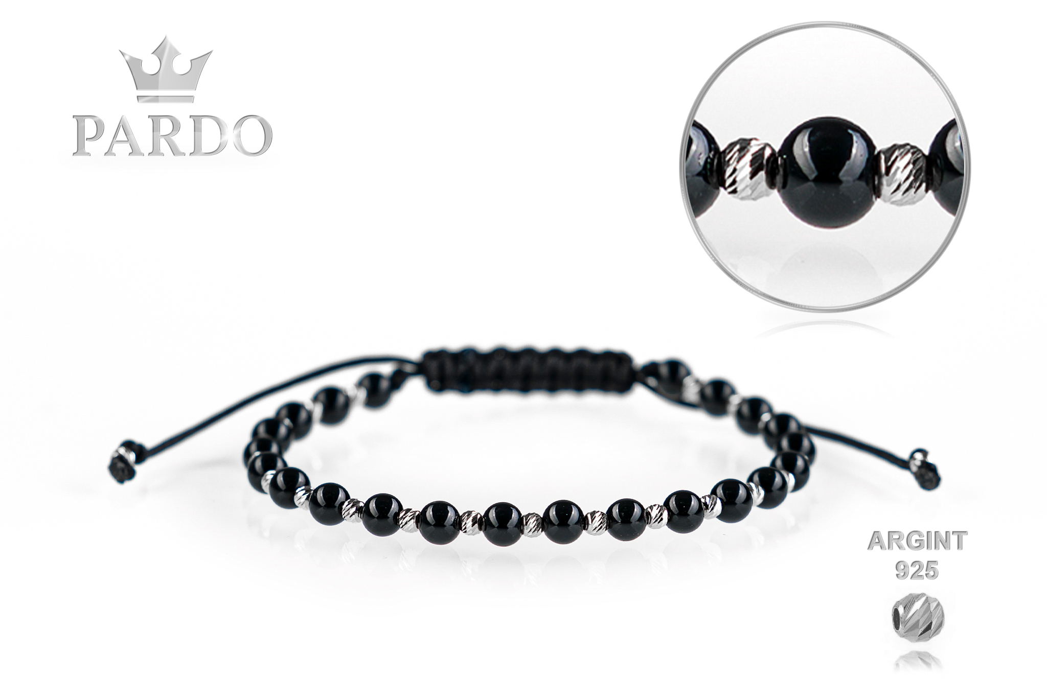 Brățară PARDO cu Argint 925 realizată manual în atelier propriu cu șnur de calitate premium, folosind o combinație unică de sfere striate din Argint 925 import Italia și pietre semiprețioase sau cristale de tip Onix cu diametrul de 4 mm.