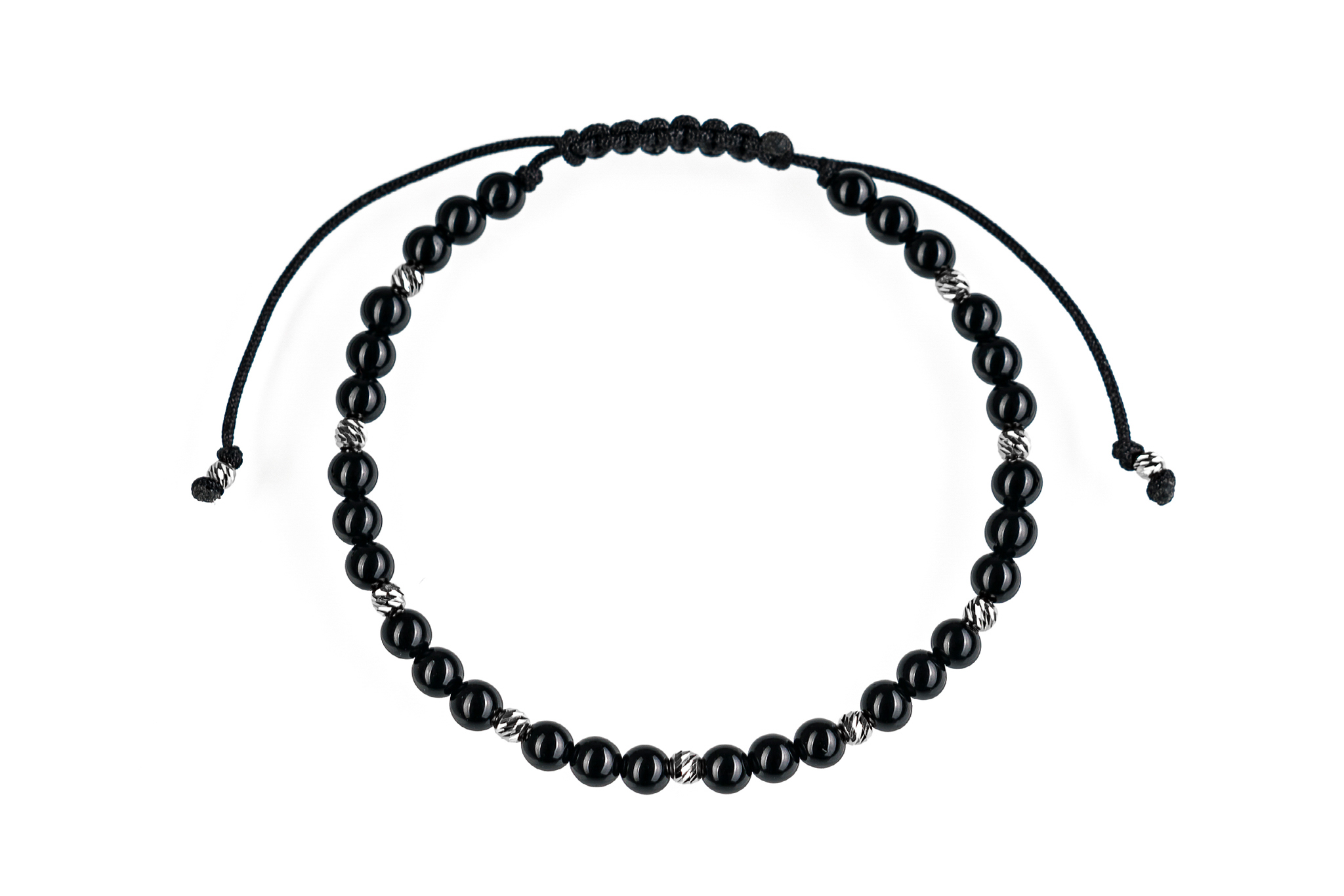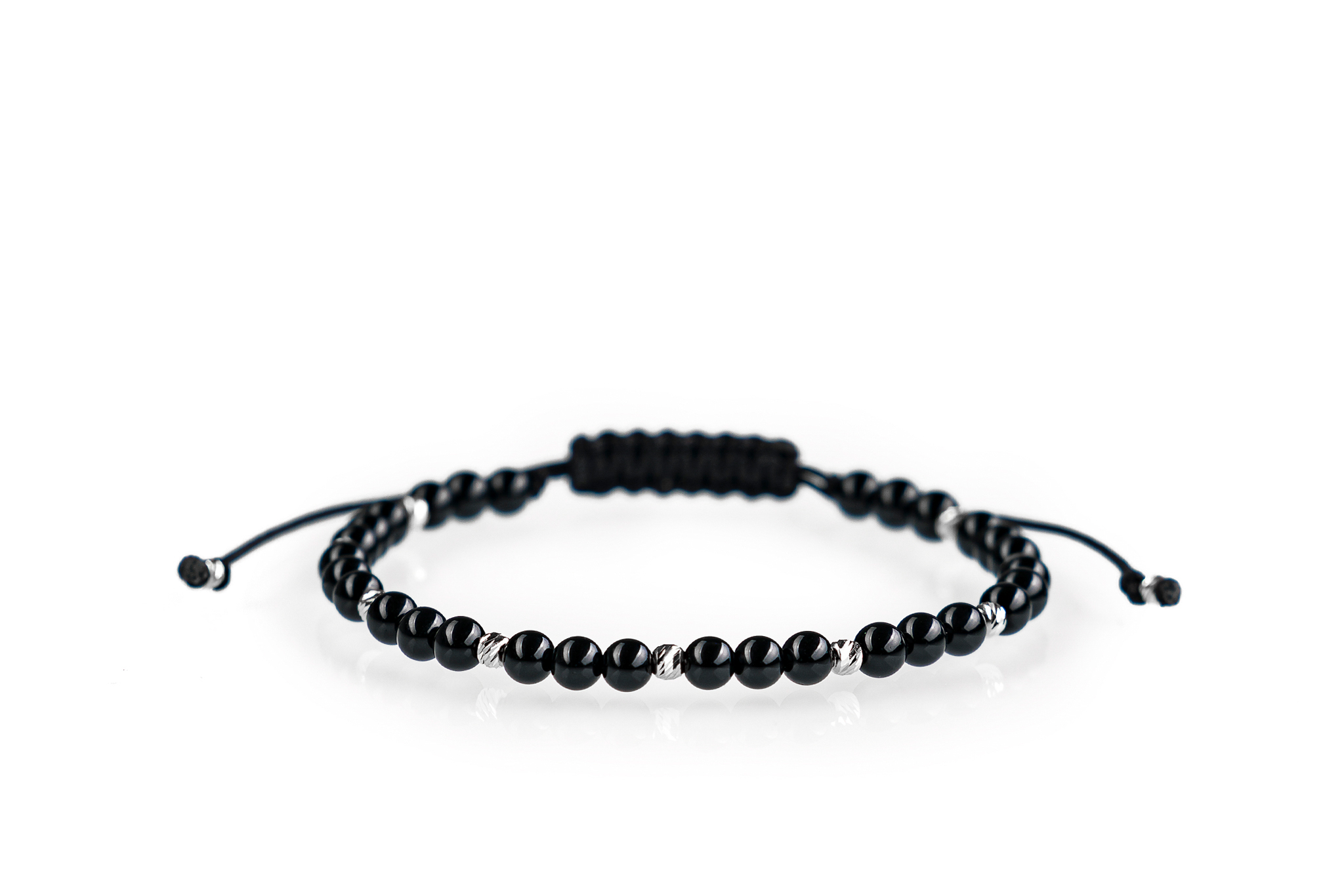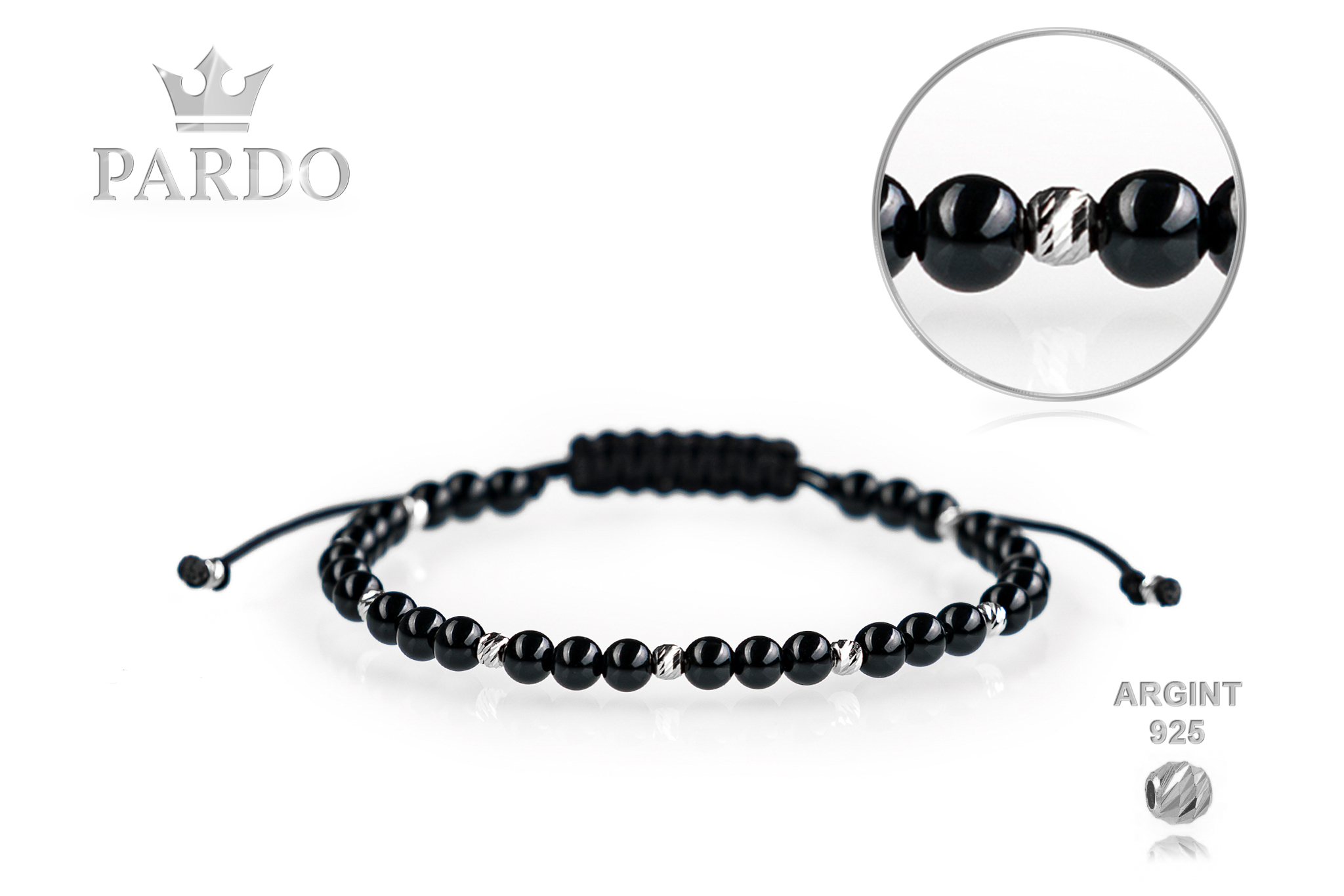 Brățară PARDO cu Argint 925 realizată manual în atelier propriu cu șnur de calitate premium, folosind o combinație unică de sfere striate din Argint 925 import Italia și pietre semiprețioase sau cristale de tip Onix cu diametrul de 4 mm.