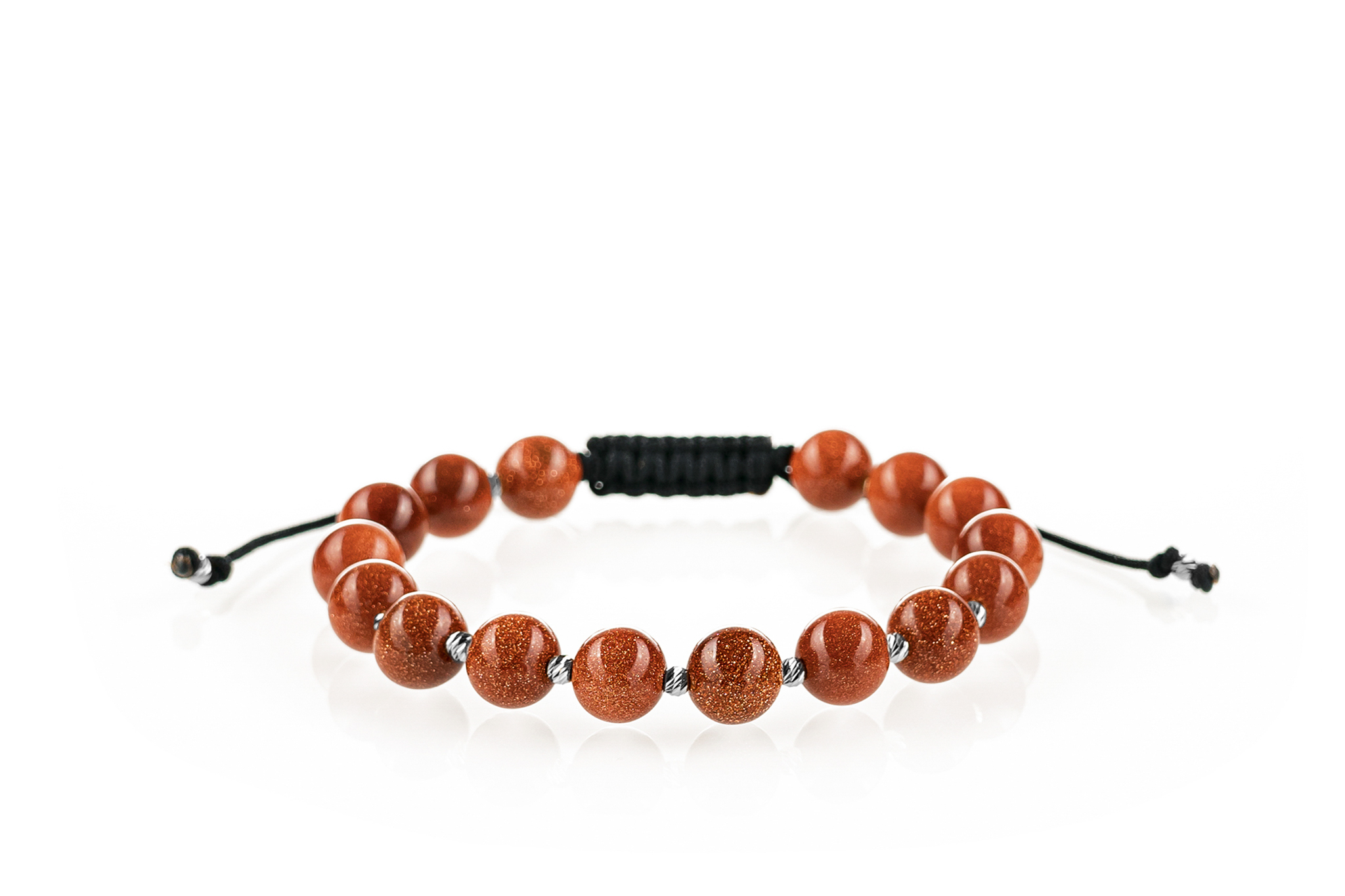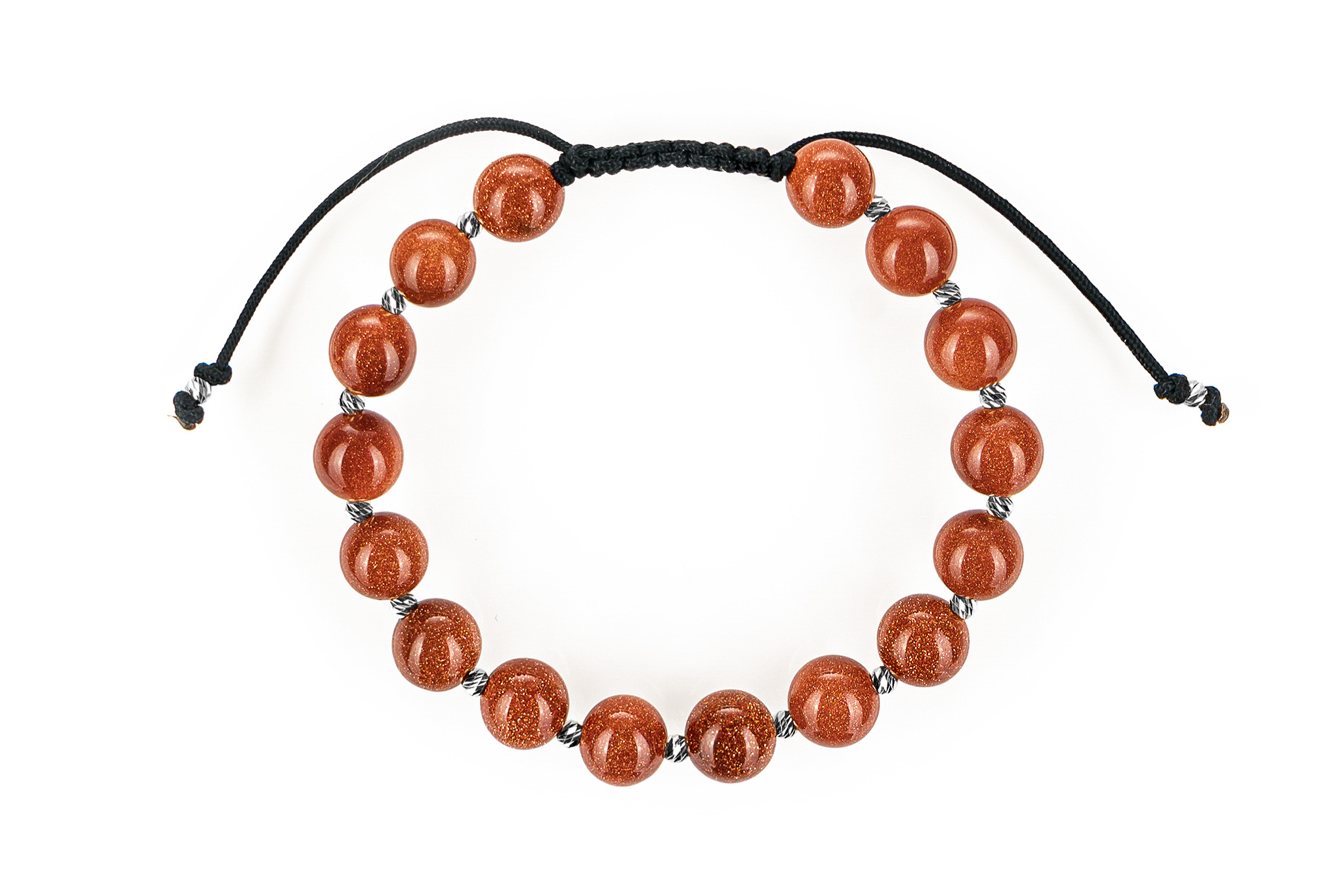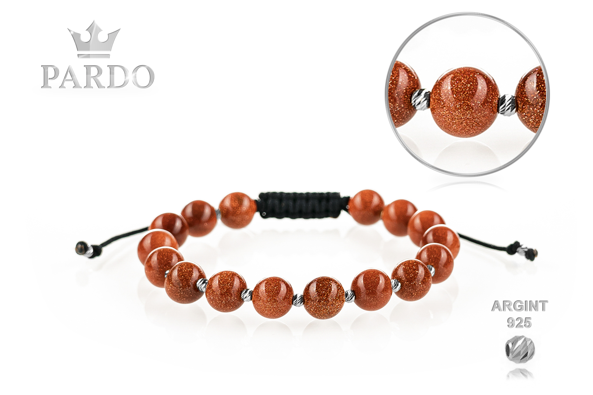 Brățară PARDO cu Argint 925 realizată manual în atelier propriu cu șnur de calitate premium, folosind o combinație unică de sfere striate din Argint 925 import Italia și pietre semiprețioase sau cristale de tip Piatra Soarelui cu diametrul de 8 mm.