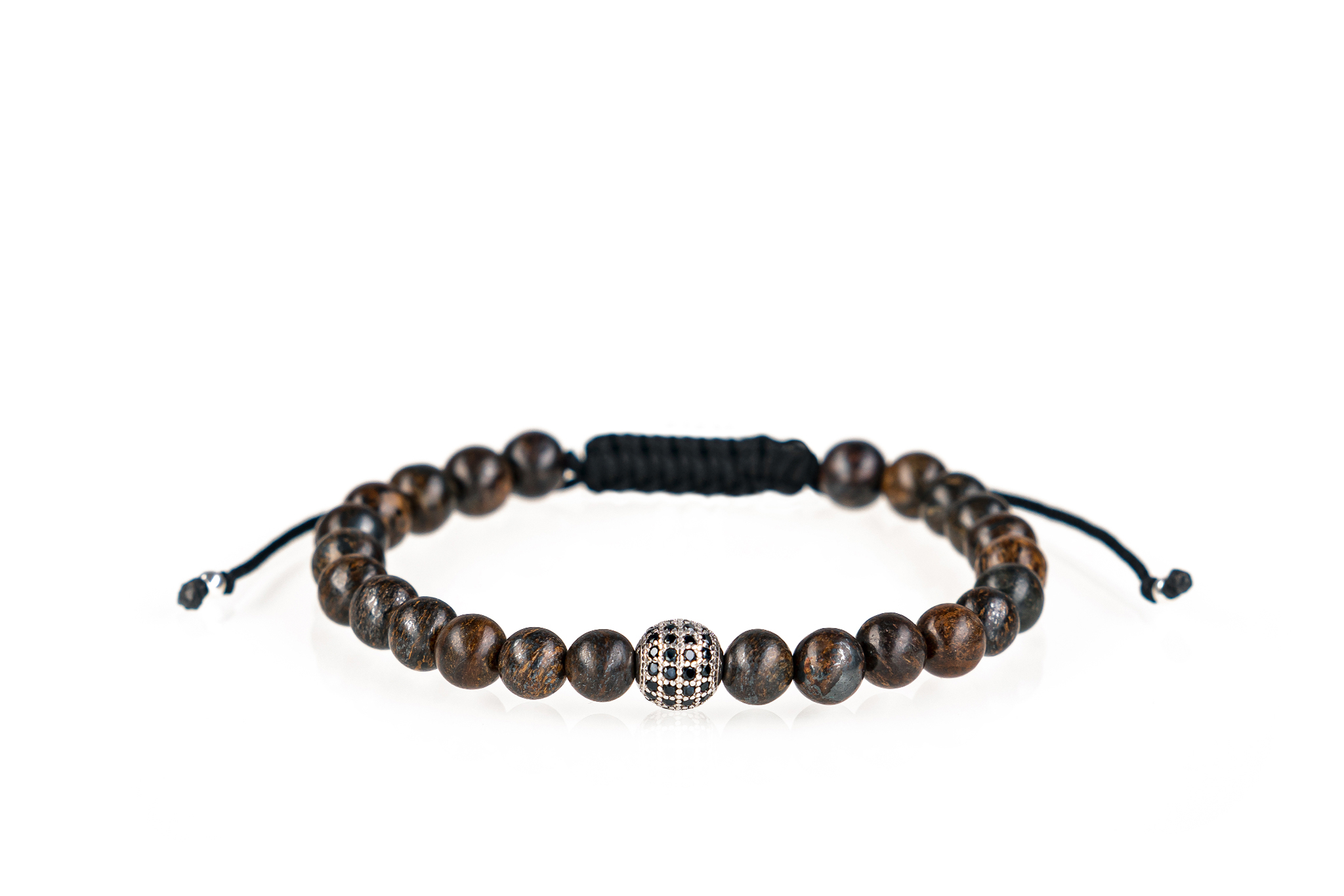 Brățară PARDO realizată manual în atelier propriu cu șnur de calitate premium folosind o combinație unică de sfere din Argint 925 încastrate cu Cubic Zirconia (CZ) și pietre semiprețioase Bronzit cu diametrul de 6 mm.